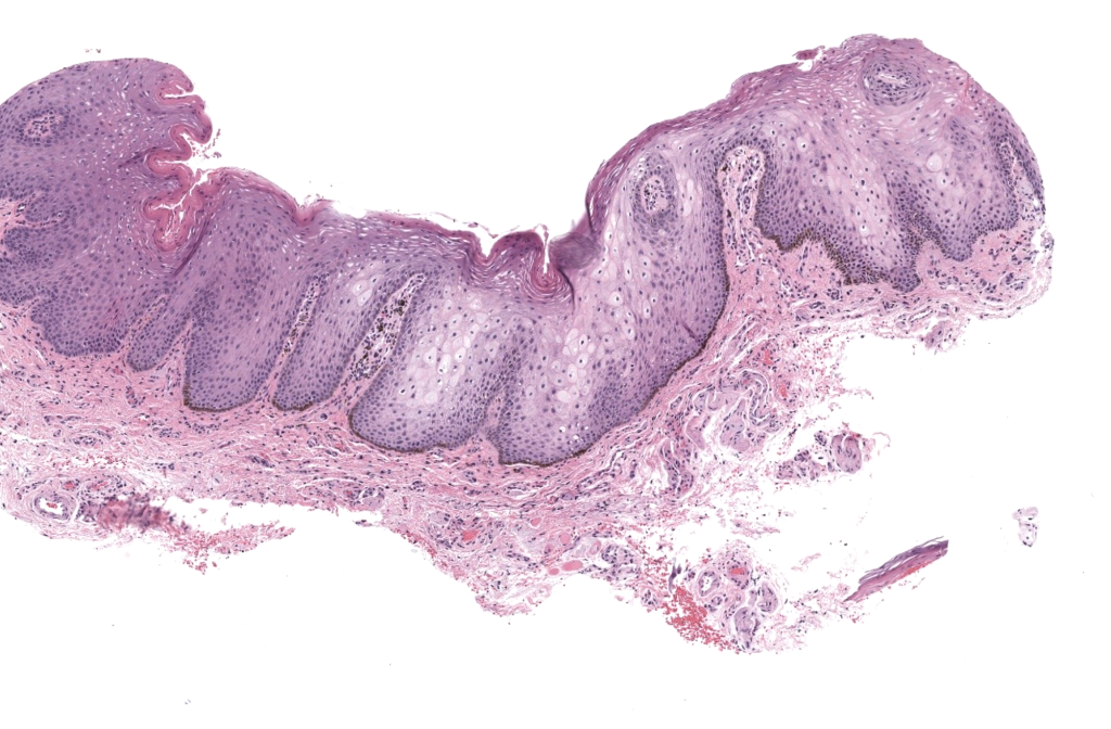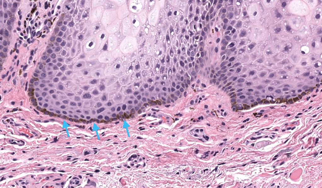 - La mácula melanótica (melanotic macule) es una hiperpigmentación macular benigna de mucosa (frecuente en labio y cavidad oral, y también en vulva/periné), caracterizada histológicamente por aumento de melanina en la capa basalcon mínima o nula proliferación melanocítica y sin atipia significativa. Kaugars 1993, Ho 1993, De Giorgi 2020