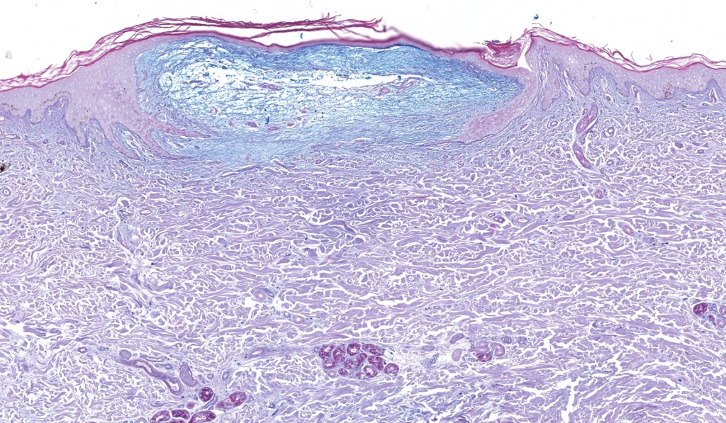 Biopsia adecuada: punch profundo/escisional; pedir Alcian blue pH 2.5, hierro coloidal y hialuronidasa(confirmar hialuronato).