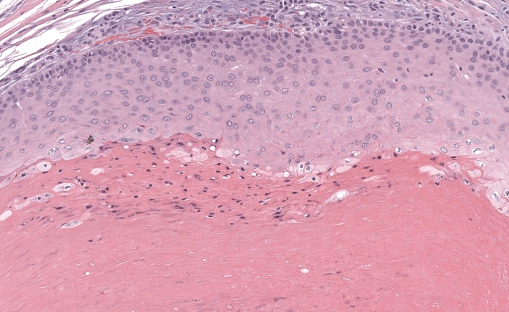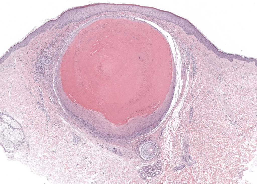Histología: queratinización triquilemal, sin estrato granular, cápsula gruesa, ± calcificación.