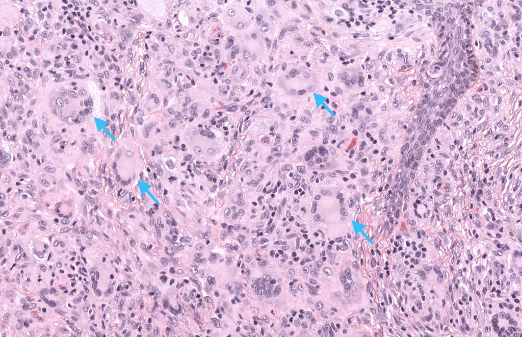 - Proliferación de histiocitos (dermales/factor XIIIa+) con respuesta inflamatoria variable; en la mayoría de los casos cutáneos es autolimitado. Alteraciones activadoras en vías MAPK/ERK y, en subgrupos extracutáneos, alteraciones CSF1R, ALK y fusiones CLTC::SYK/NTRK1 han sido descritas (implicación terapéutica en casos sistémicos/atípicos).