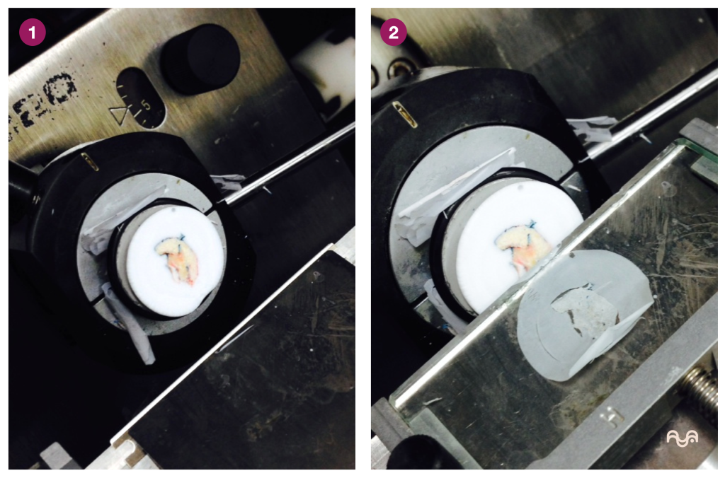 Cirugía de Mohs / Cortes histológicos: Una vez orientado y marcada la muestra se procede a realizar cortes finos en el criostato, para sacar «tajadas finas» de los márgenes y ser teñidas para su evaluación al microscopio
