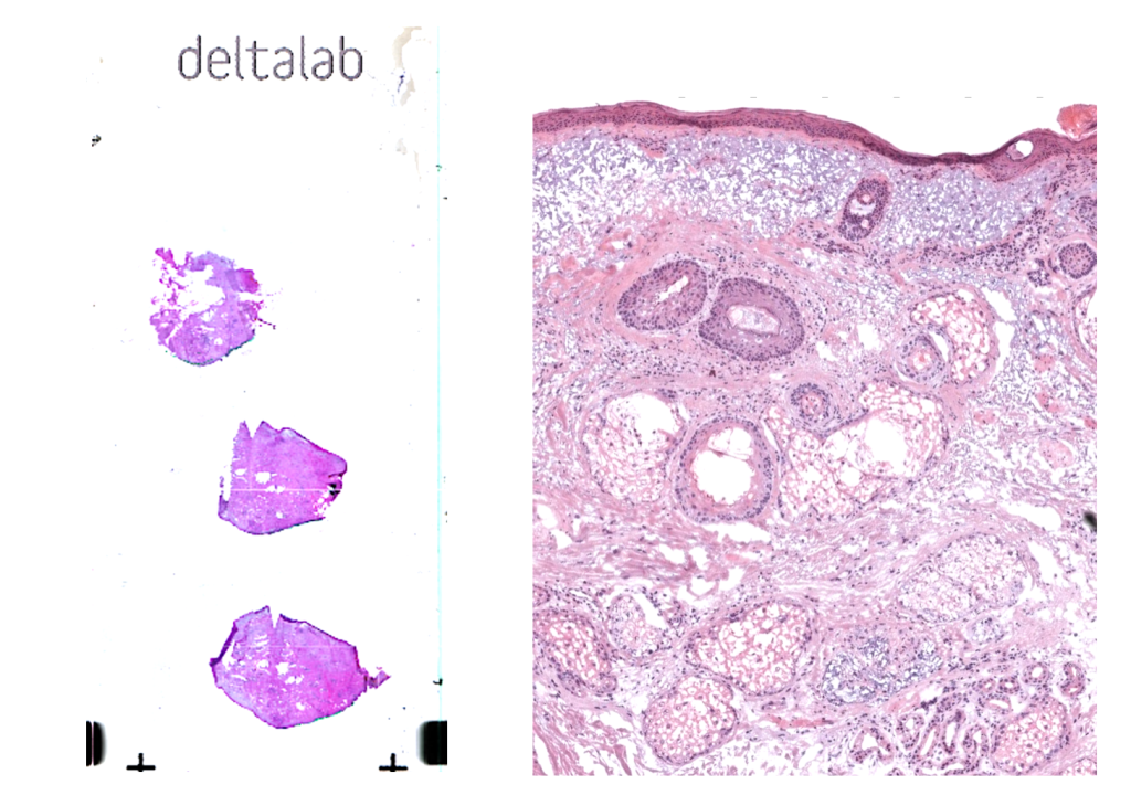 Cirugía de Mohs/evaluación microscópica: Una vez recolectadas las «tajadas» del tejido se procede a teñir y luego a visualizar al microscopio en busca de células neoplásicas. Si no se identifica tumor en los márgenes quiere decir que la resección fue completa y que no será necesario quitar más tejido